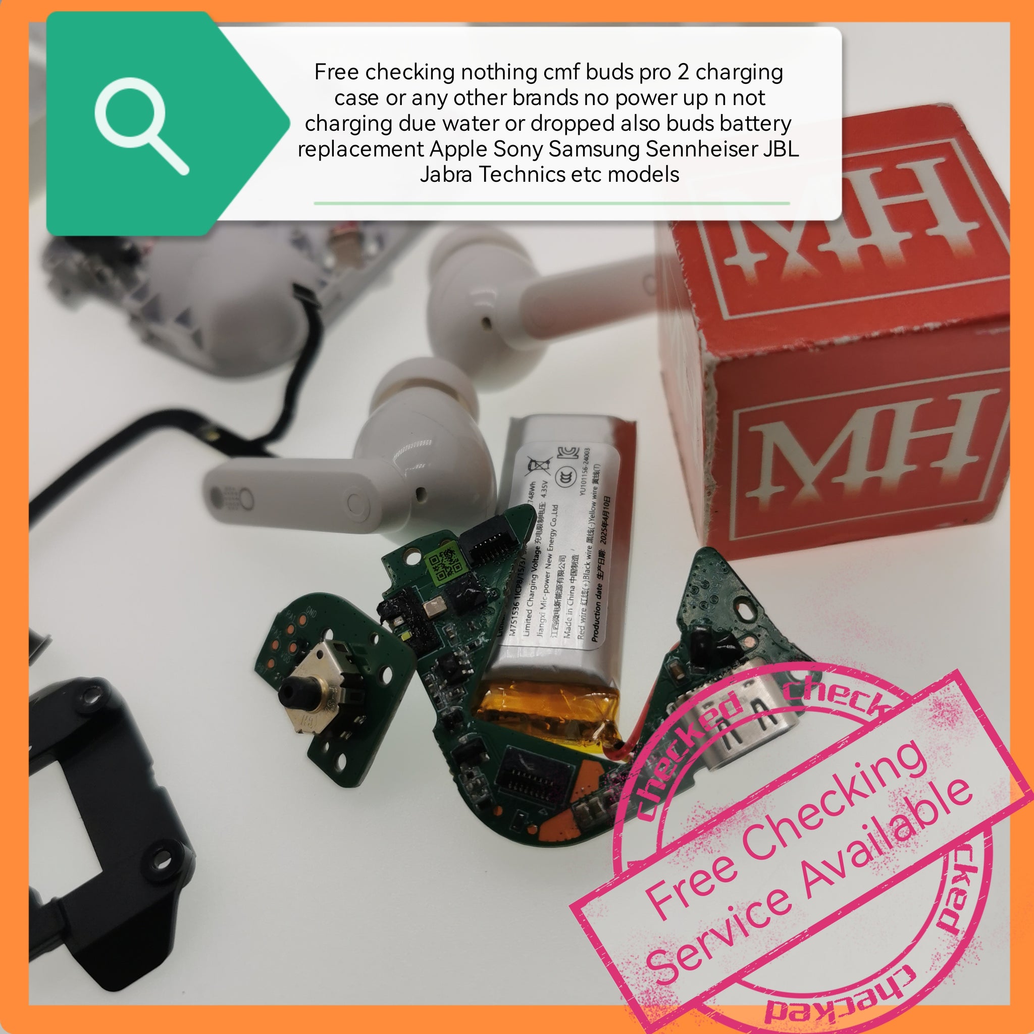 Free checking Nothing cmf buds pro 2 charging Case or any other brands no power up n not charging due water or dropped also buds battery replacement Apple Sony Samsung Sennheiser JBL Jabra Technics etc models