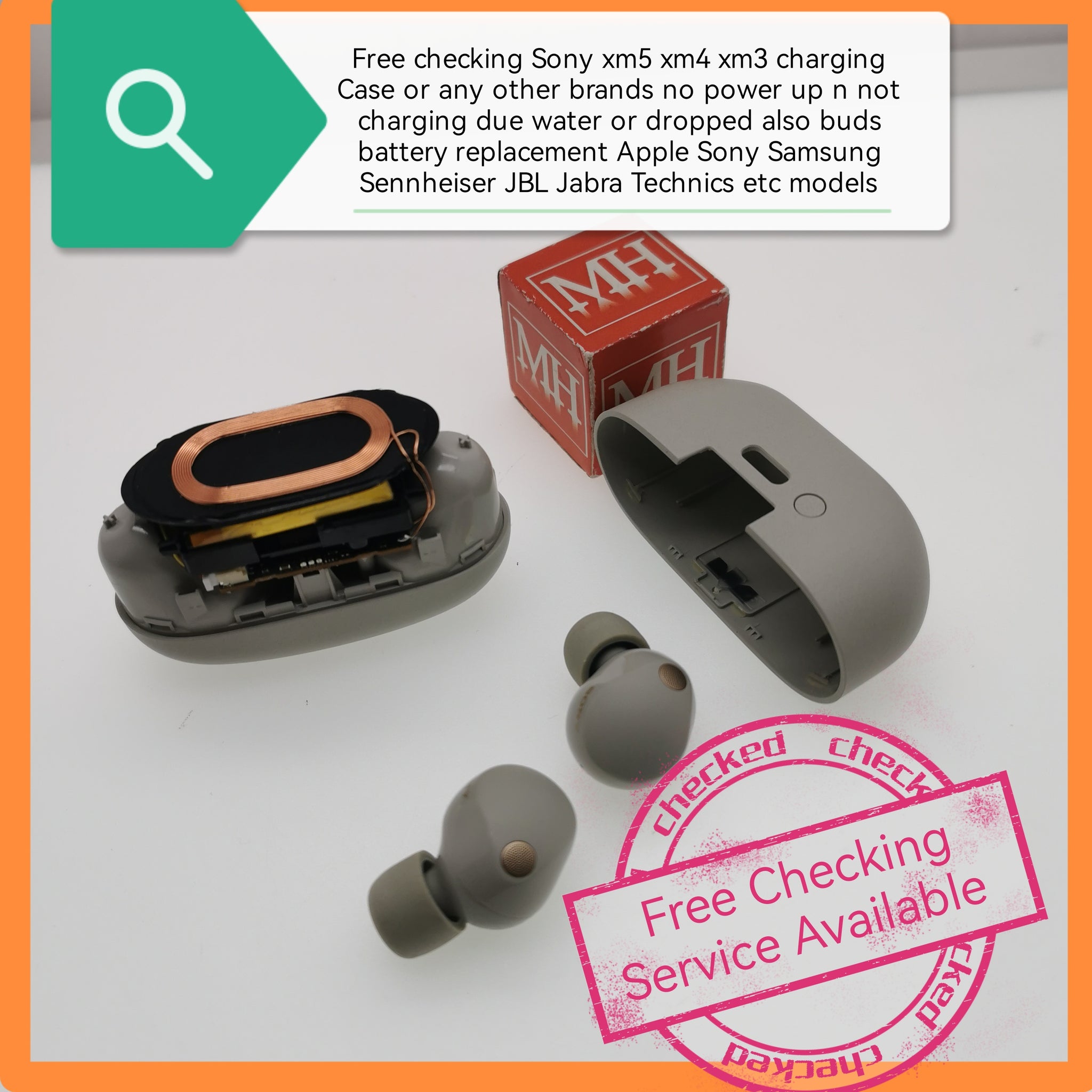 Free checking Sony xm5 xm4 xm3 charging Case or any other brands no power up n not charging due water or dropped also buds battery replacement Apple Sony Samsung Sennheiser JBL Jabra Technics etc models