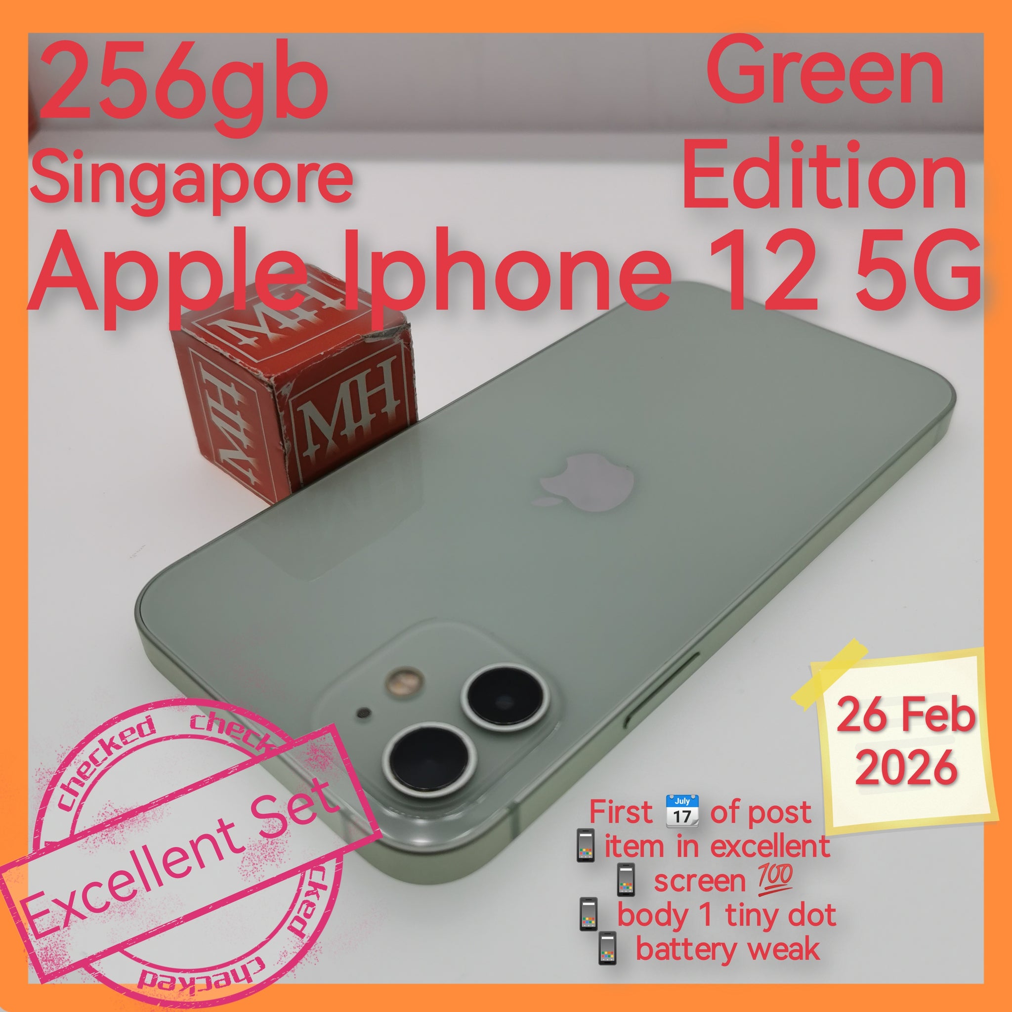 256gb Singapore apple iphone 12 5G green with glass set